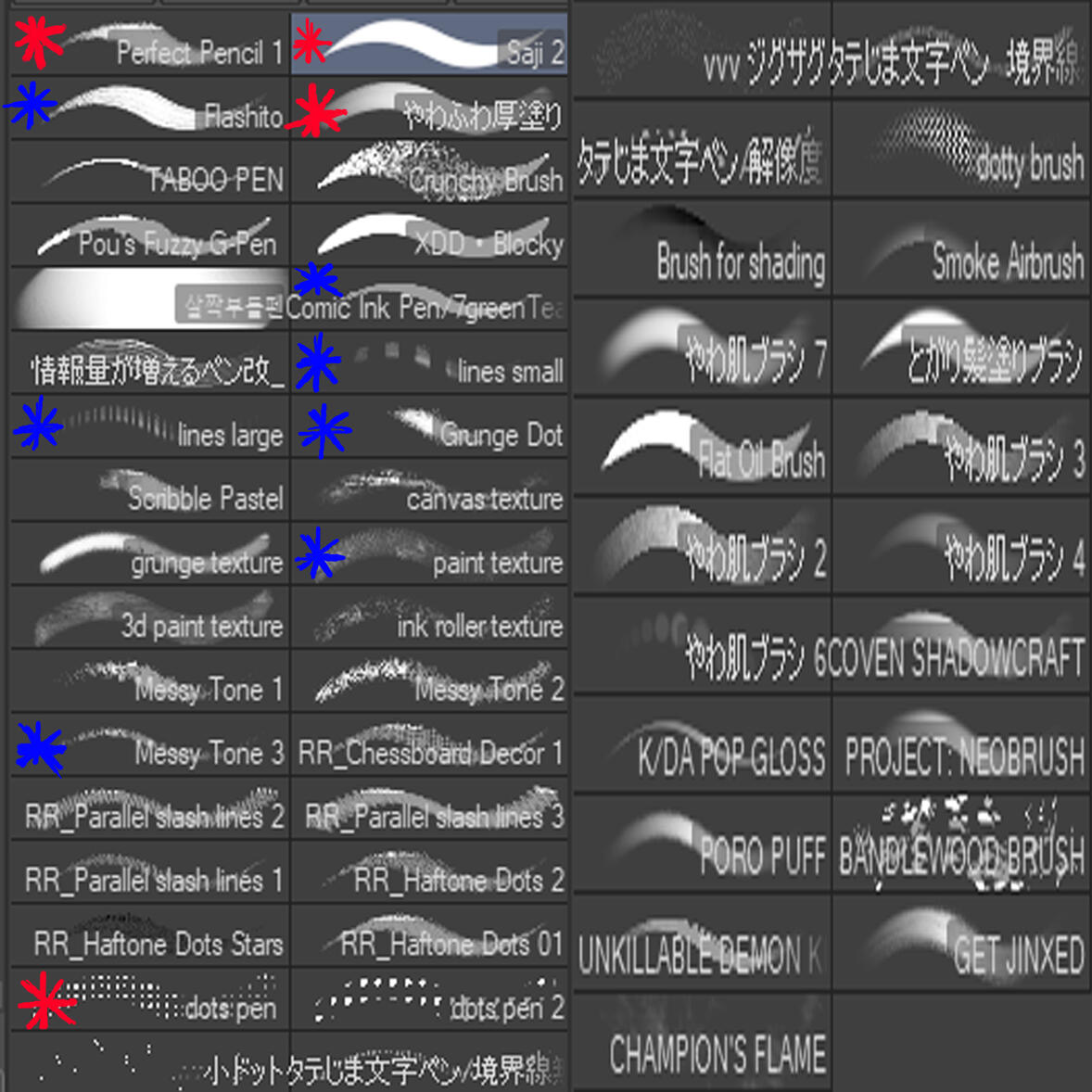 I don't gonna lie, i don't use all this. Actually i have more 💀 but the red ones are the main (i used them for the wally draws) and the blue one are These are some that you haven't seen use much, but I really recommend them. They are for more elaborate drawings. Sorry If you don't understand them or can't find them on the clip studio paint website, I will update this to make it easier for you.